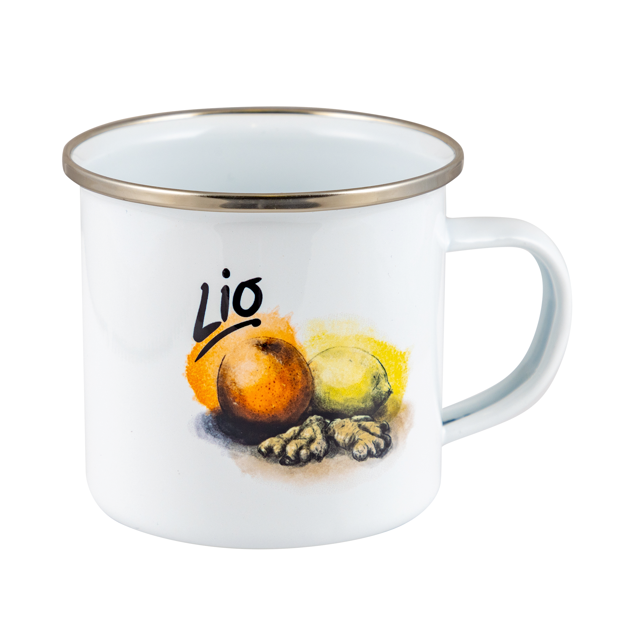 Geschälten Ingwer in die Lio Emailletasse (oder in eine Teetasse) geben und mit heißem Wasser übergießen. Lio hinzufügen und gut verrühren. Mit den Scheiben von Zitrone und Orange dekorieren.